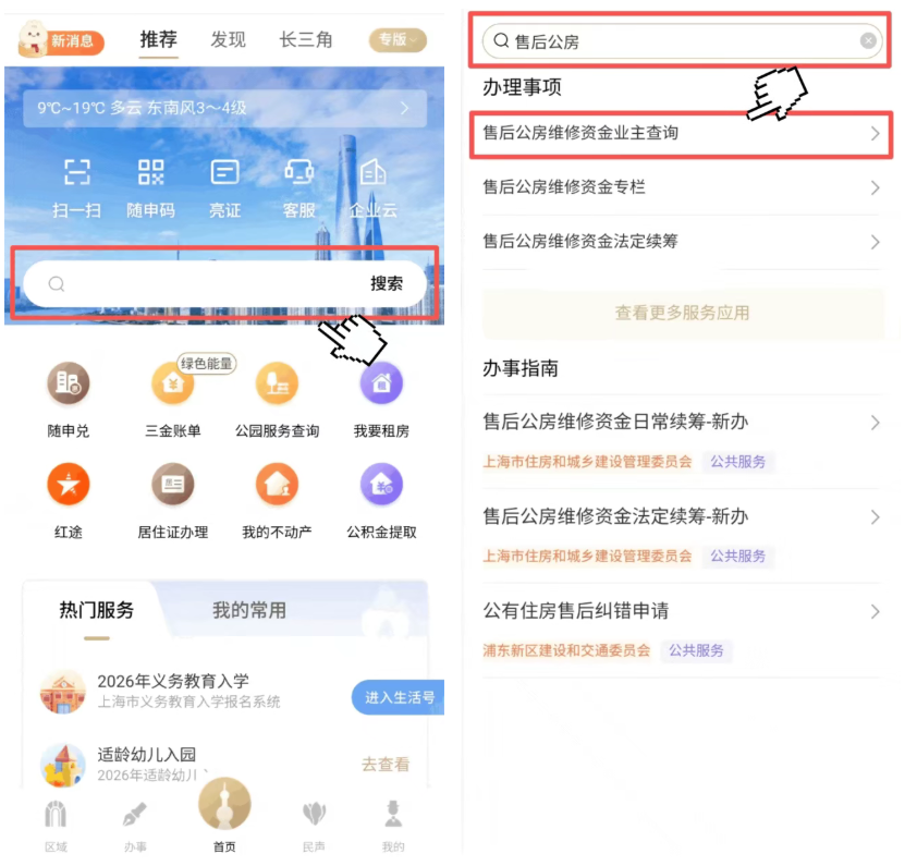 打开“随申办市民云”APP,首页搜索“售后公房”找到“售后公房维修资金业主查询”服务。