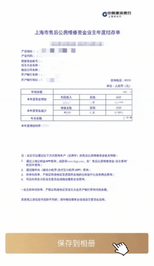 2、如您仍需要纸质结存单,可通过以下方式获取:业主凭身份证、18位产业代码或者12位产业账号(未开通)前往就近建设银行网点打印纸质结存单。