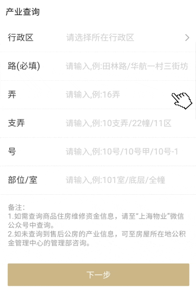 1、进入“随申办”查询页面填写地址信息,点击“下一步”,选择对应的地址信息。