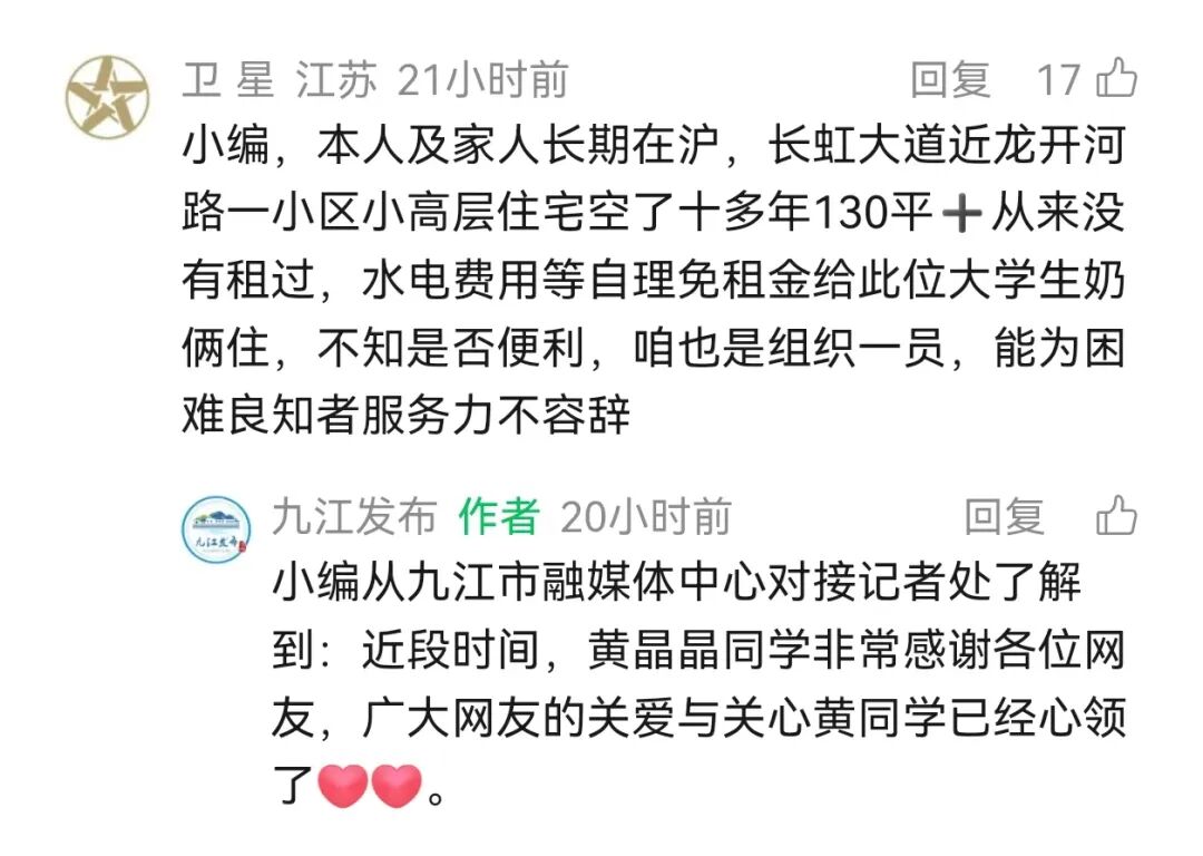 “我愿意资助学费。”“好孩子,如果需要,可以来我公司看看有没有合适的岗位。”“本人及家人长期在沪,我有一套房子从来没有出租过,愿意免租金给此位大学生及奶奶居住。”……除了有不少九江市民通过社交平台留言,表示想尽自己一份绵薄之力。还有多位爱心人士及企业联系到学校,提出想帮黄晶晶减轻生活负担,分担照护奶奶的压力。