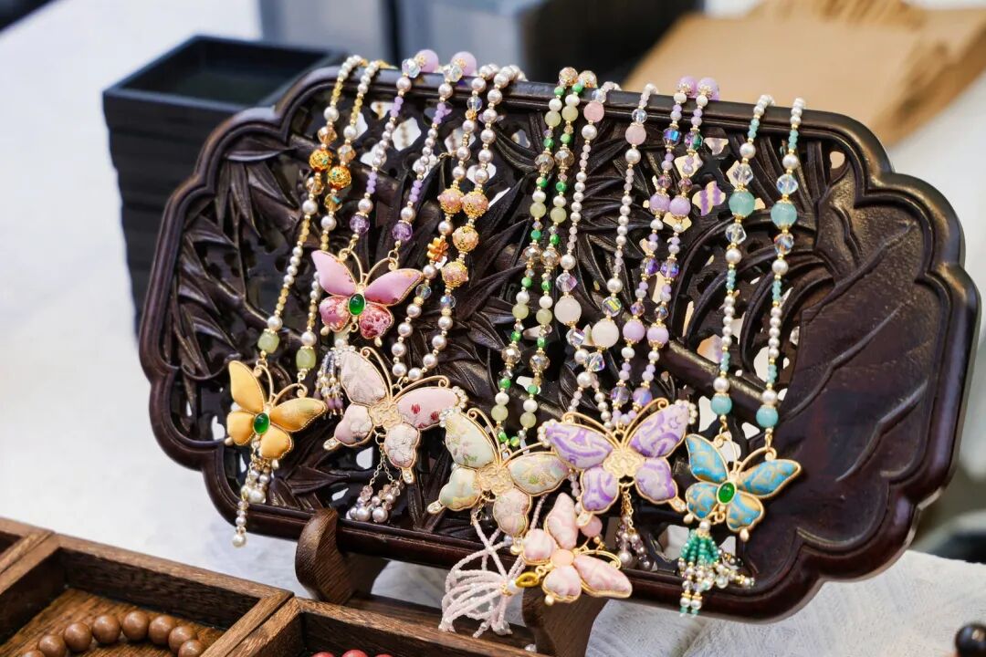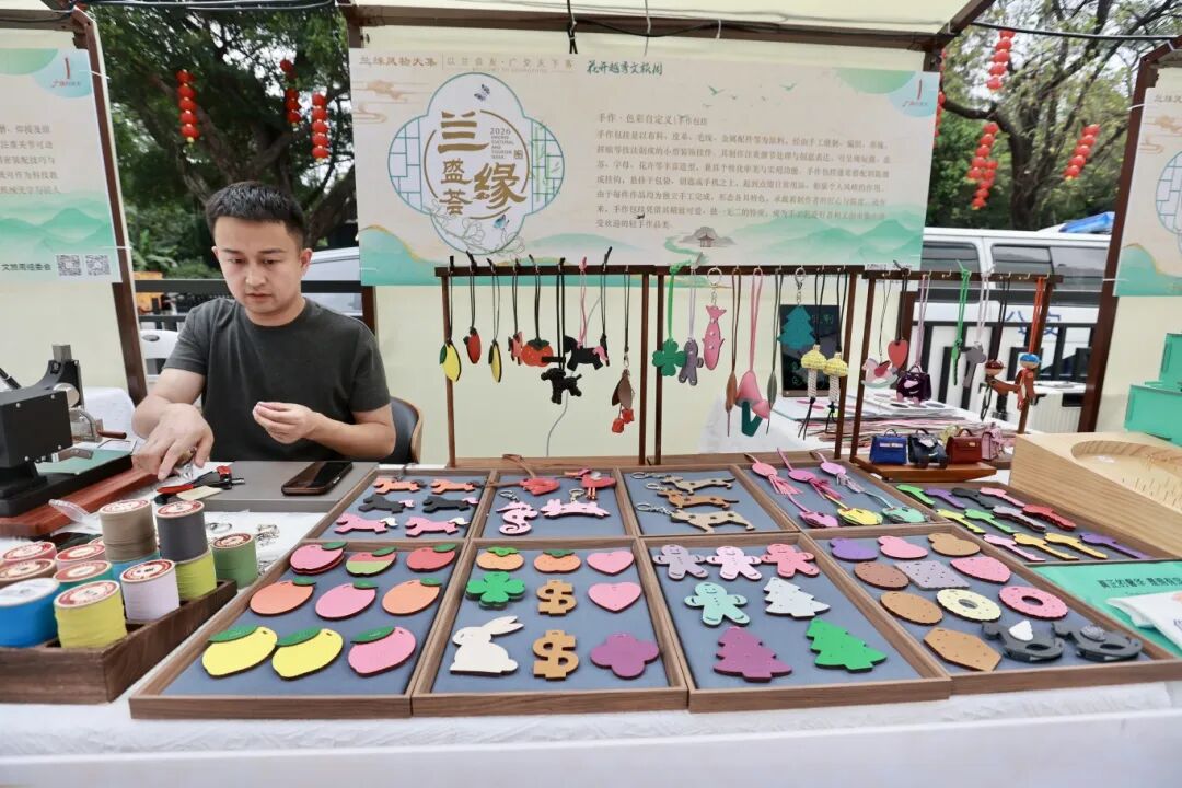 本次风物大集亮点纷呈,汇集了众多非遗技艺与匠心品牌。千年宋锦、木雕、蓝染、珐琅彩,手工绕线饰品、扩香花,以及承载岭南记忆的皮雕、螺钿点翠、押花等作品,皆凝聚着匠人的温度与文化的厚度。