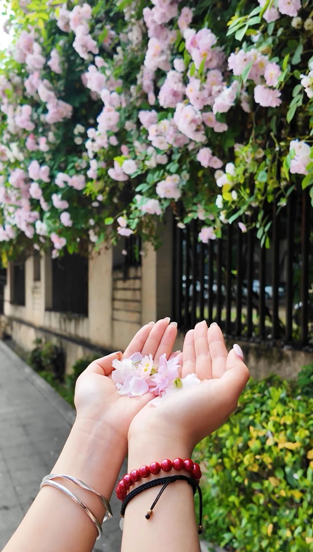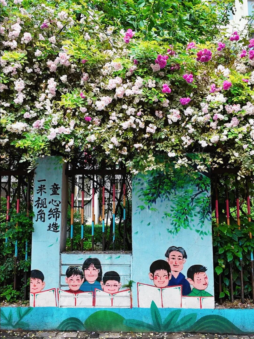风过处,花枝轻摇,细碎的花瓣簌簌飘落,暗香浮动,清甜的气息漫过街巷,浸在每一寸空气里。墙下的童趣彩绘与繁花相映,放学的孩子牵着家长的手走过,笑声混着花香,让平凡的归途满是治愈的暖意。