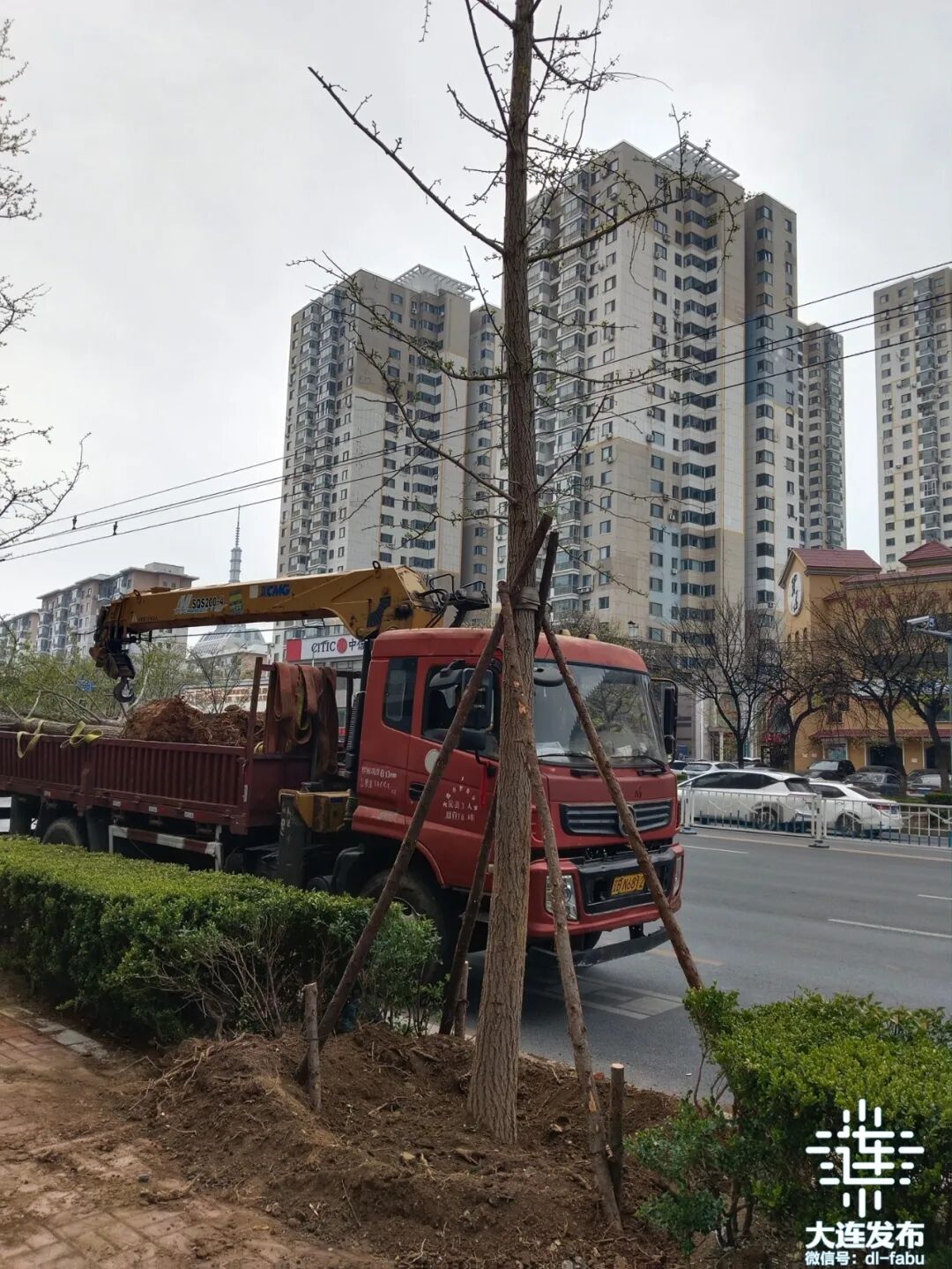 4月16日下午,在黄河路与大同街交叉口,西岗区市政中心绿化养护人员正在进行路边行道树的补植工作。