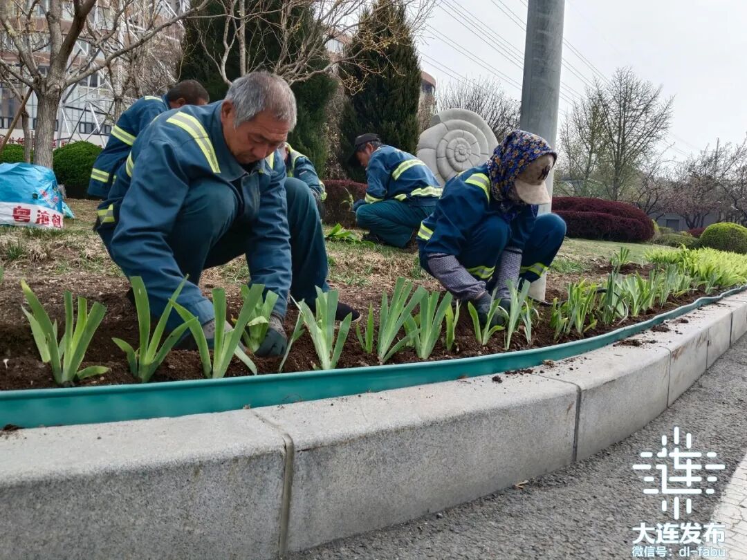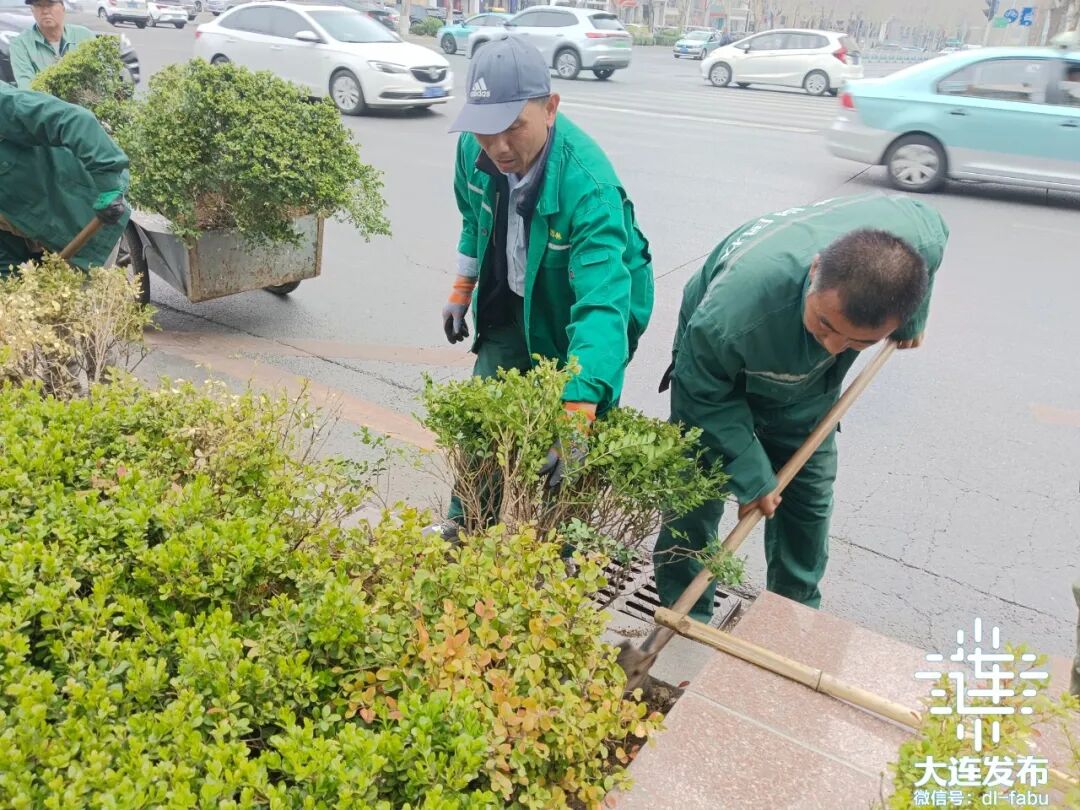 4月16日上午,在位于西北路春柳街道丝绸路社区服务中心门前,沙河口区市政中心绿化养护人员正在补植道边花坛绿植。工人们在补植的同时,对栽植深度、株距等细节严格把控,并同步做好浇水、施肥等养护工作。