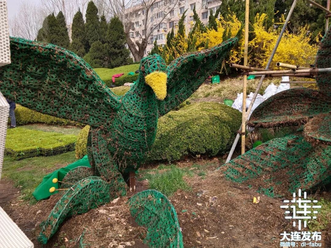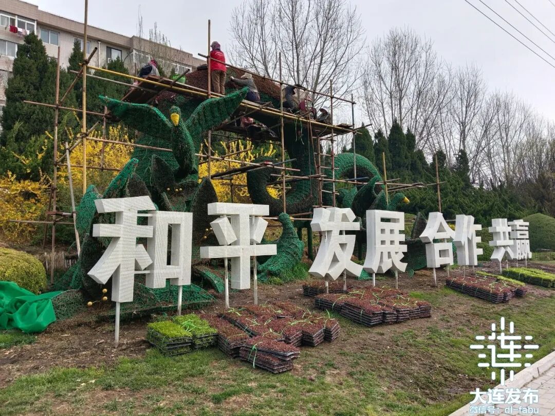 不远处,一座以和平鸽为主题的立体景观小品格外吸睛,几名工人正站在临时搭建的脚手架上,精心进行五色草栽植作业。