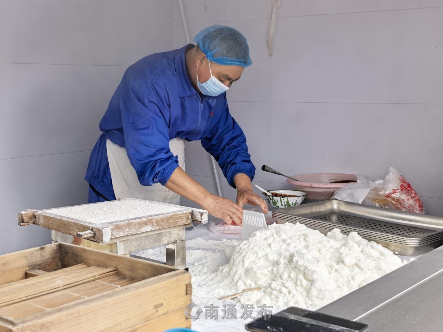 雪白的米粉过筛、洒水,湿度恰到好处,再注入新鲜桂花红豆馅,封面、盖戳、上笼……一系列动作行云流水。片刻后,一盘盘冒着热气的窨糕出锅,摊位前排起了小长队。“做窨糕讲究多,空气温度不能太高,米粉湿度也得刚刚好,水分少了易开裂,多了口感粗糙。”摊主一边忙碌一边自豪地说,“这款桂花豆沙馅最受欢迎,还接到不少外地订单呢。”
