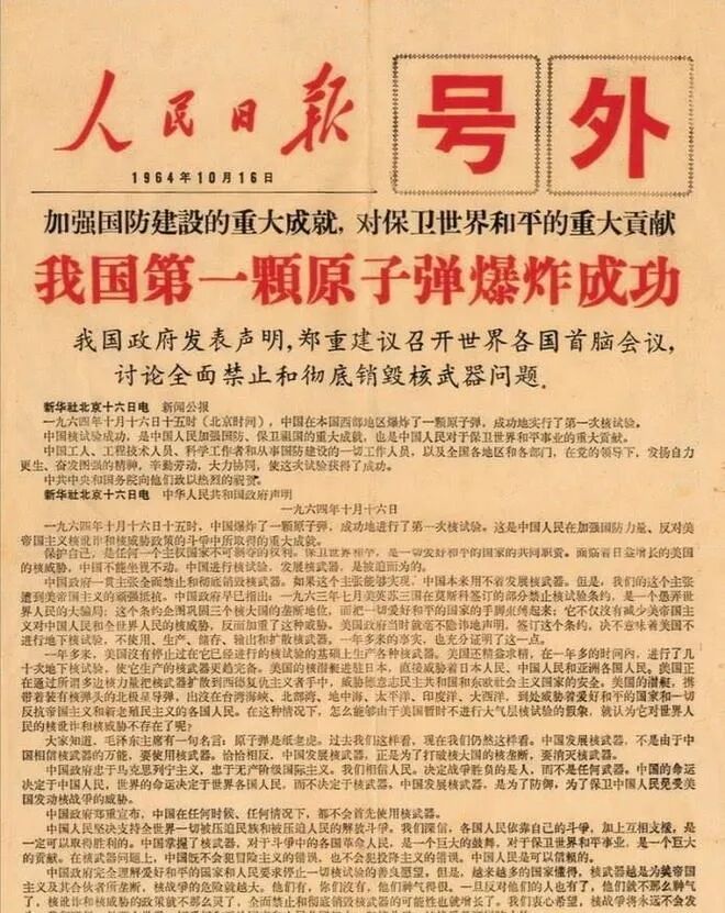 1964年10月16日,中国第一颗原子弹成功爆炸。