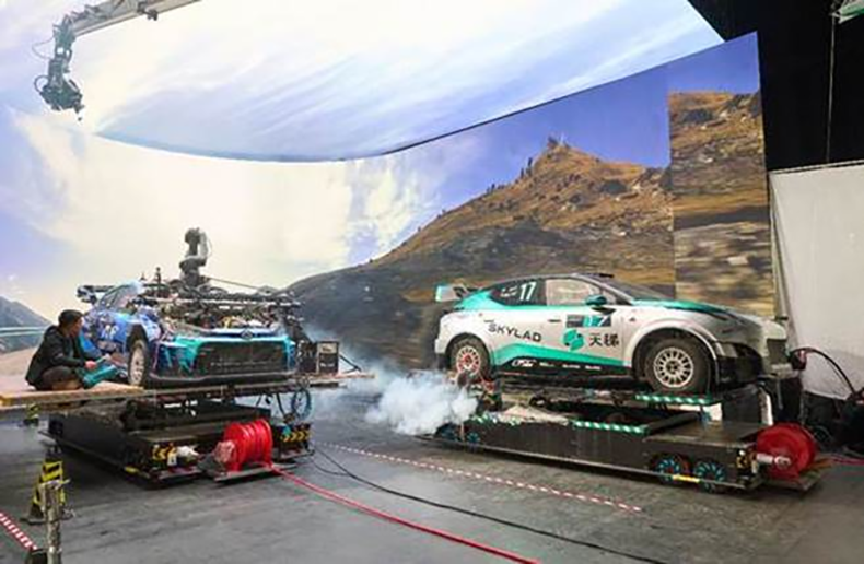 团队自主研发的无轨多自由度数控车戏拍摄平台,其核心装置“移动+震动一体化拍摄平台车”将实时渲染与Motion Control(运动控制)技术相结合,突破性地实现了极端路况模拟、路边换胎、双车竞速、超车碰撞等拍摄需求。