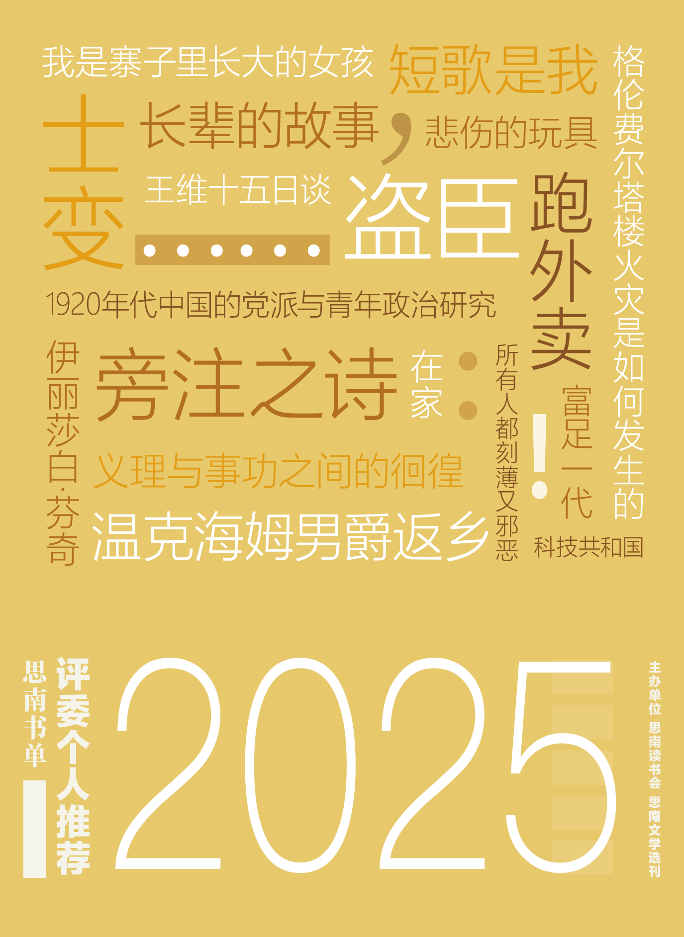 此外,在投票产生“正榜”以后,每位评委也推荐若干部个人特别激赏却最终未能进入正榜的作品,它们组成了“思南书单2025”的“评委个人推荐榜”。