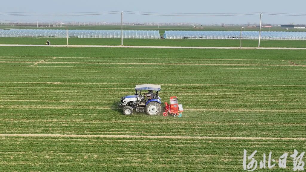3月9日,在邢台市南和区邵屯村农田,农民驾驶农机为小麦施肥。河北日报记者 赵永辉摄
