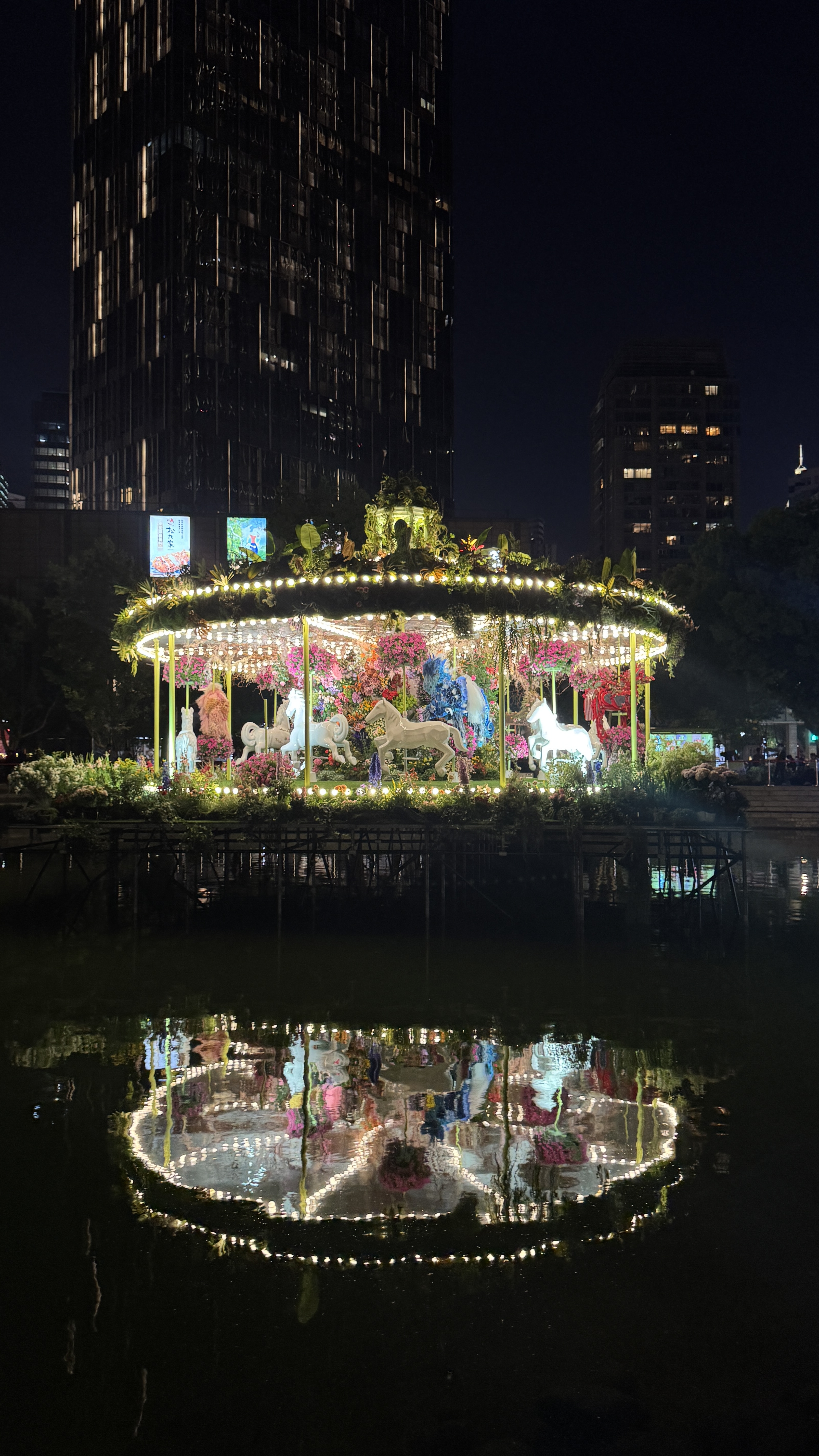 夜幕降临,灯光亮起,上海新天地太平湖中央的旋转木马缓缓转动,在平静的水面上映出倒影。几乎每一位路过的市民游客都忍不住用镜头记录下了这一场景。“是很梦幻又很浪漫,有人文气息的感觉。”一名游客赏花行至此处时不禁感叹。