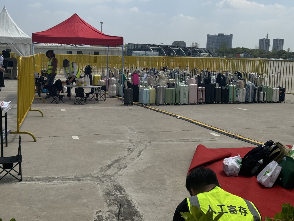 除了餐饮服务,行李存储与人工寄存点位也同样忙碌。据人工寄存点工作人员介绍,为满足观赛者的寄存需求,他们早上6点半就抵达现场,而最早的游客7点就来存放行李。“光一个早上,我们这里就接收了近400件行李箱,加上柜子存储的,整体寄存量非常大。”该工作人员表示,赛场周边分布着近20个行李存储点位,“情况都差不多,柜子早上10点左右就基本放满了,大件行李或者柜子满了放不下的,就会转到我们人工寄存点。”