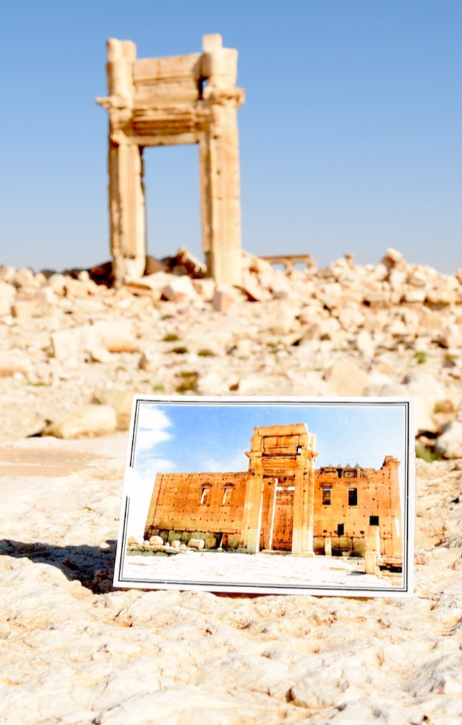 2026年4月18日,一张2024年11月13日拍摄的老照片被放置在叙利亚帕尔米拉古城遗址废墟前,对比可见该遗址受到的巨大破坏。新华社 图