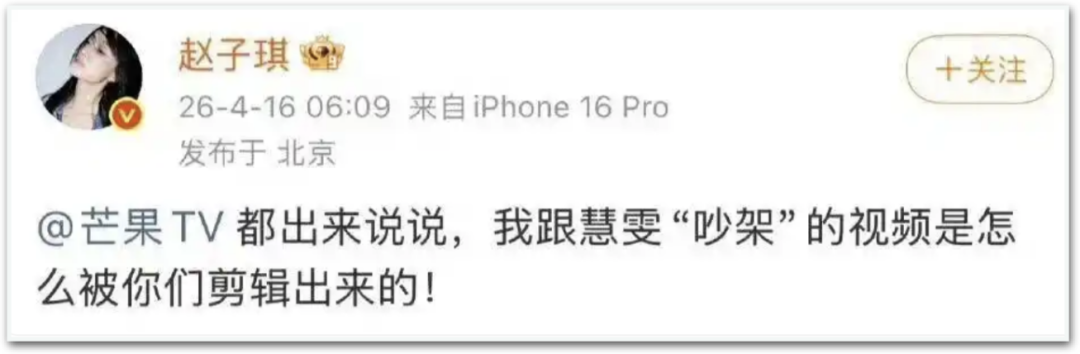 最新一期节目呈现出她和张慧雯的剑拔弩张后,她第一时间连发多条博文,将矛头直指节目组,质问吵架视频是怎么被剪辑出来的,直接放话“是要逼我曝所有的料吗?”。