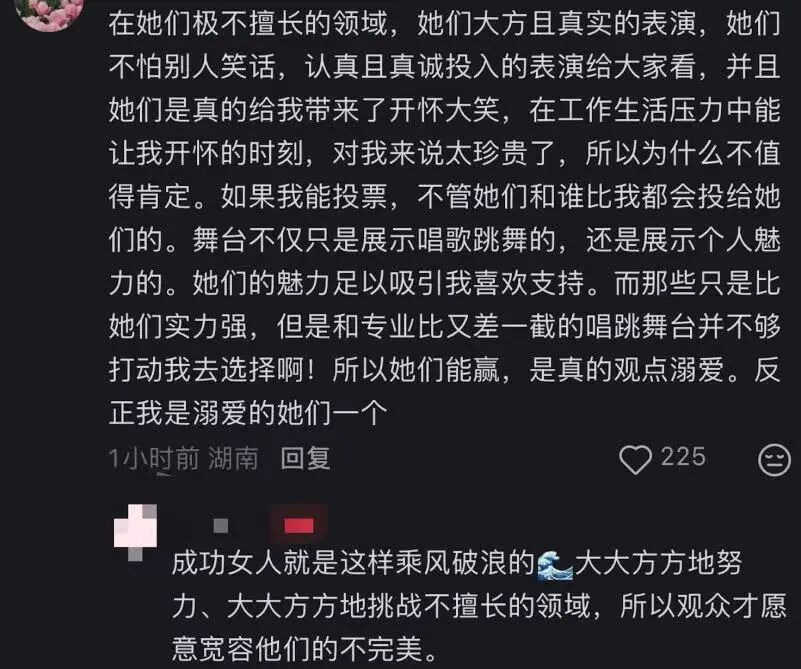 有网友感慨,“她们在极不擅长的领域,大方真实地表演,她们不怕被人笑话,认真且全情地投入表演,这真的给我带来了开怀大笑。”