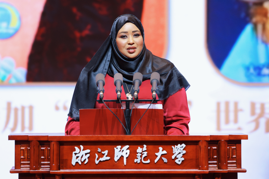 校友代表、索马里联邦共和国驻华大使和丹追忆起浙师的求学岁月,是如何在她心里种下文明互鉴的种子,让她感知到非洲研究不仅仅在建设一个学科,更是在搭建一座连接中国与非洲的心灵桥梁。她强调,浙师既是求知的殿堂,更是精神的故乡,母校在教会知识的同时,传达一种理解世界、沟通中非的胸怀。她期望,一代代浙师人继续秉持这份初心,讲述中非友好故事,书写文明互鉴新篇。