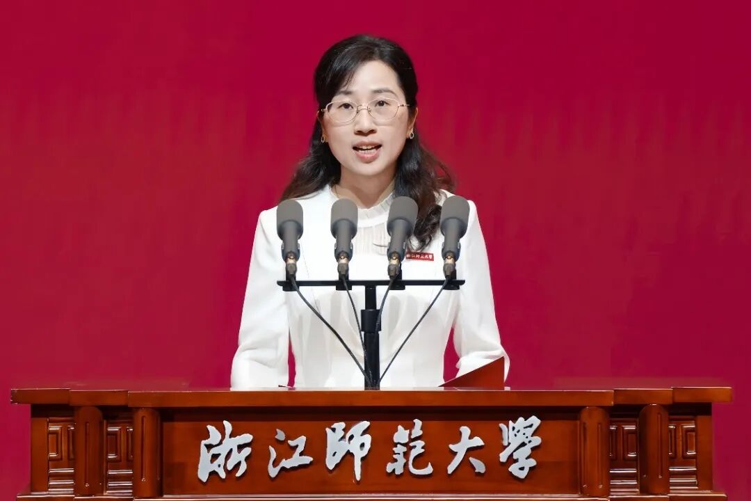 教师代表、儿童发展与教育学院曹漱芹回忆了从2004年接手筹建特殊教育专业重任到编制完成全国首部孤独症儿童教育指南、落地全国首个国家级特殊教育资源中心、组建全国最大的孤独症专职研究团队的创业历程。她强调,个人的成长,只有融入学校和国家的发展,才能迸发出最耀眼的光芒。曹漱芹期望每一位浙师人以校训为引,在各自领域深耕不辍,共同为教育强国建设书写浙师新的辉煌。