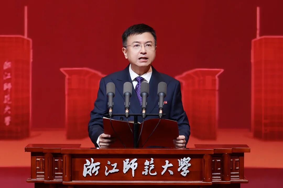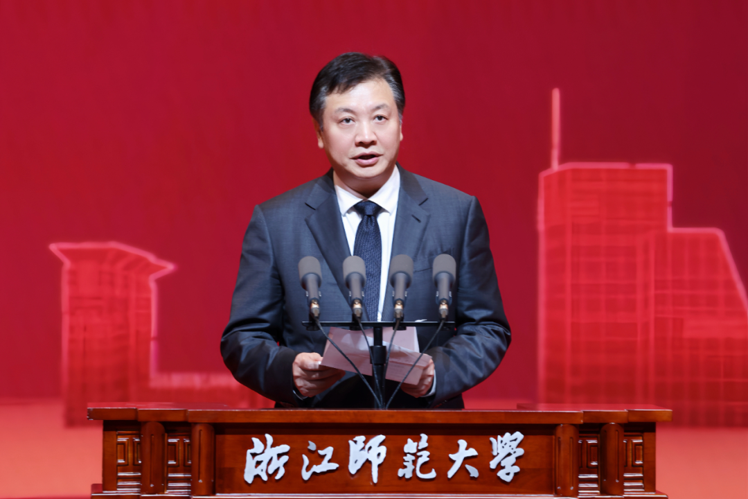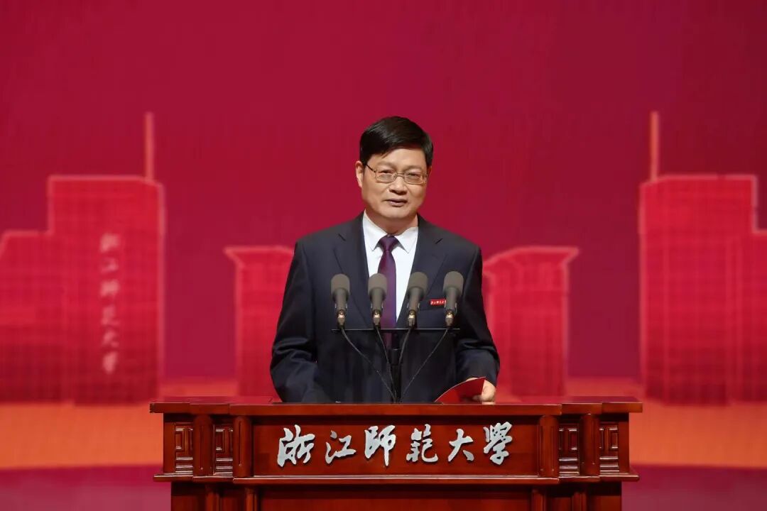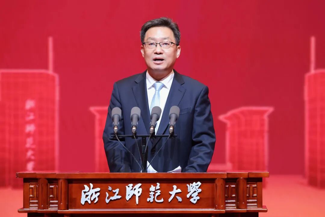 朱重烈代表市委、市政府和全市人民向浙师大全体师生员工和广大校友致以诚挚祝贺。他说,浙师大70年的奋斗历程,是新中国高等教育发展的生动缩影,也承载着一代代浙师人砺学砺行、维实维新的精神品格。七十载砥砺奋进路,浙师大始终与时代同频、与家国共振,书写了艰苦卓绝的创业史、笃行不怠的奋斗史、立德树人的育才史,镌刻弦歌不辍、薪火相传的芳华记忆。七十载风雨同舟情,浙师大南迁金华后,主动融入金华经济社会发展主战场,为推动金华高质量赶超发展提供有力支撑,成就校地相融、学城共兴的合作佳话。七十载扬帆再启航,相信浙师大将坚定不移沿着“综合性、高水平、特色鲜明”发展方向,紧扣总书记“4+1”重要要求和省委“132”总体工作部署,精准对接地方“十五五”发展目标,不断提升办学质量和水平,奔赴追光逐梦、攀新登高的时代征程。浙师大的每一步发展跨越都值得时代和人民所铭记、每一份信任支持都值得八婺人民由衷感恩、每一个炽热梦想都值得学校和师生们去奋斗和照亮。作为深度融合的发展共同体、命运共同体,金华为浙师大骄傲、向浙师大致敬、伴浙师大腾飞。市委、市政府将一如既往把支持浙师大高质量发展摆上重要战略位置,逐项落实新一轮全面深化战略合作框架协议,全力推动浙师大越办越好、越办越强,再创辉煌、再立新功。
