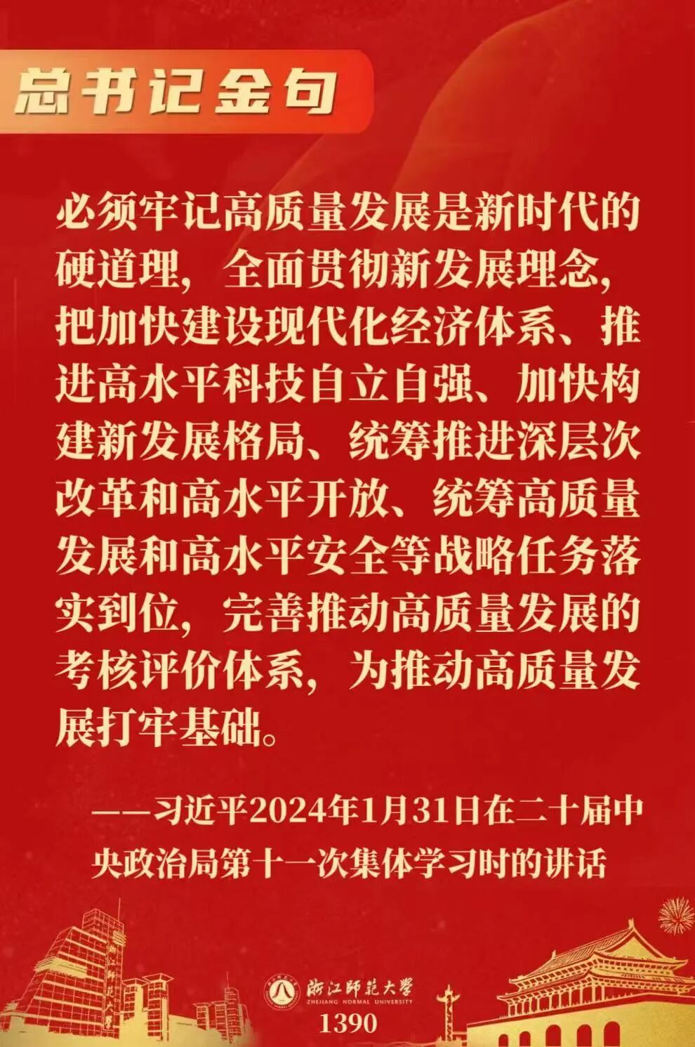 蒋云良指出,站在新的历史起点上,全校上下将持续深入学习习近平总书记考察浙江重要讲话和致我校建校50周年贺信精神,胸怀“两个大局”,心系“国之大者”,贯彻落实省委“132”总体工作部署和“双一流196工程”,全面加强党的领导,提高办学治校水平,全面落实立德树人根本任务,全面融入全国和浙江高质量发展大局,大力弘扬教育家精神,做深做透教科人一体化改革发展和“两新”深度融合“两篇大文章”,砥砺奋进,勇毅前行,为全面建成特色鲜明的一流大学而奋斗,在中国式现代化和教育强国建设中作出新的更大贡献。