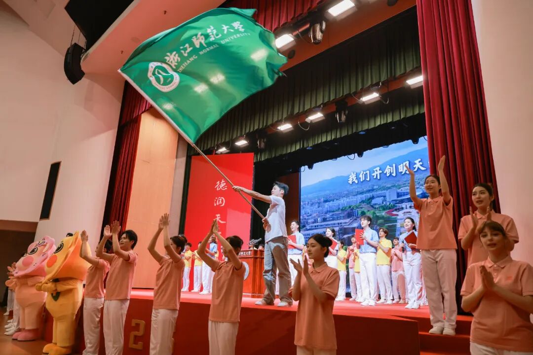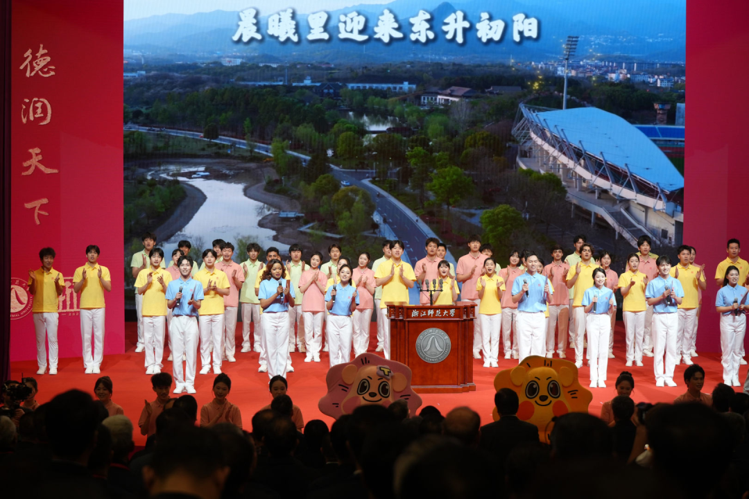 “巍巍北山,悠悠钱江,晚风中送别西下新月,晨曦里迎来东升初阳……”会场旗帜飘扬,全体起立,带着对未来的无限憧憬,齐唱《浙江师范大学校歌》,建校70周年高质量发展大会在激昂的校歌声中圆满落幕。