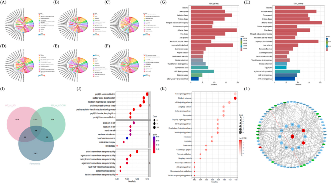 KEGG通路分析进一步表明,AD模型中氧化应激、谷氨酸能突触异常等通路被激活,而CH-I显著调节了谷氨酸能突触、氧化磷酸化、cAMP及mTOR信号通路,这些均与铁死亡密切相关。通过将差异表达基因与铁死亡相关基因取交集,获得75个核心基因;对其再次富集发现,p53信号、mTOR复合物及铁离子跨膜转运活性显著改变。蛋白质互作网络分析进一步鉴定出SLC7A11和SAT1等关键铁死亡调控因子。