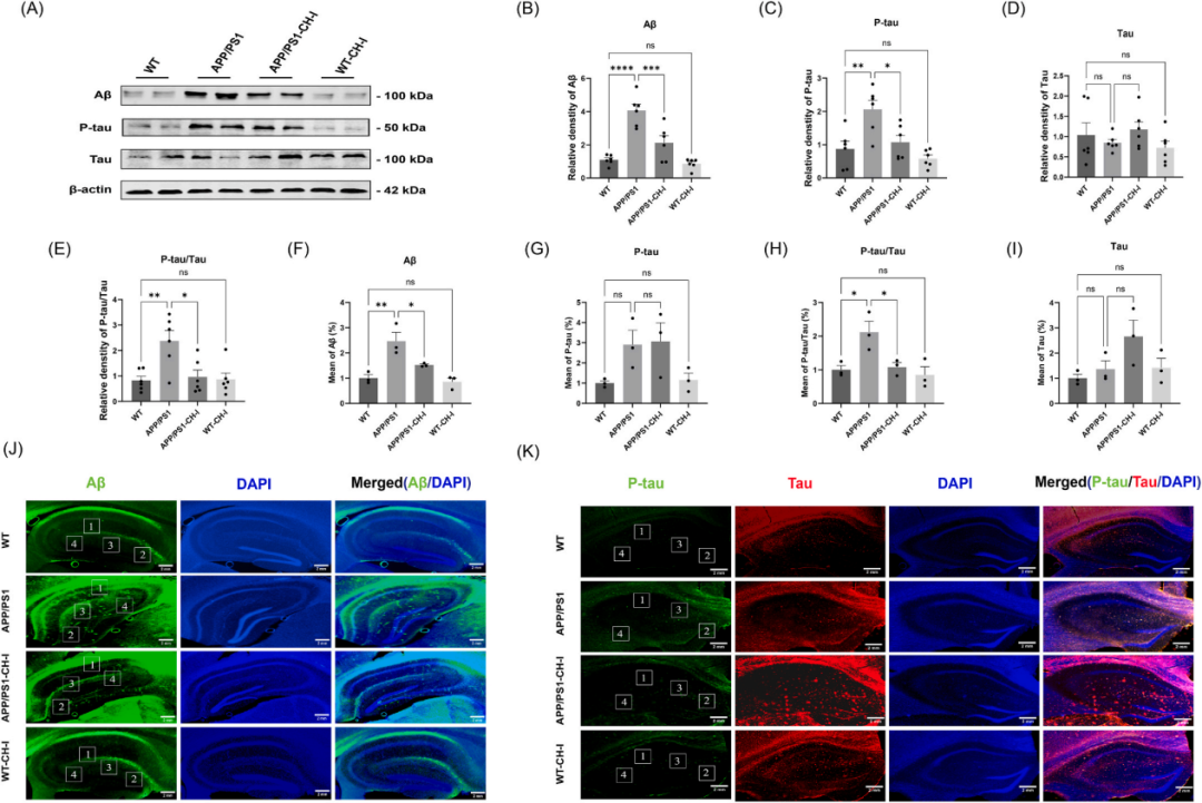 蛋白质印迹结果显示,APP/PS1组的β-淀粉样蛋白和磷酸化tau蛋白水平显著高于野生型组。CH-I显著降低了AD小鼠海马中β-淀粉样蛋白聚集和磷酸化tau的水平。