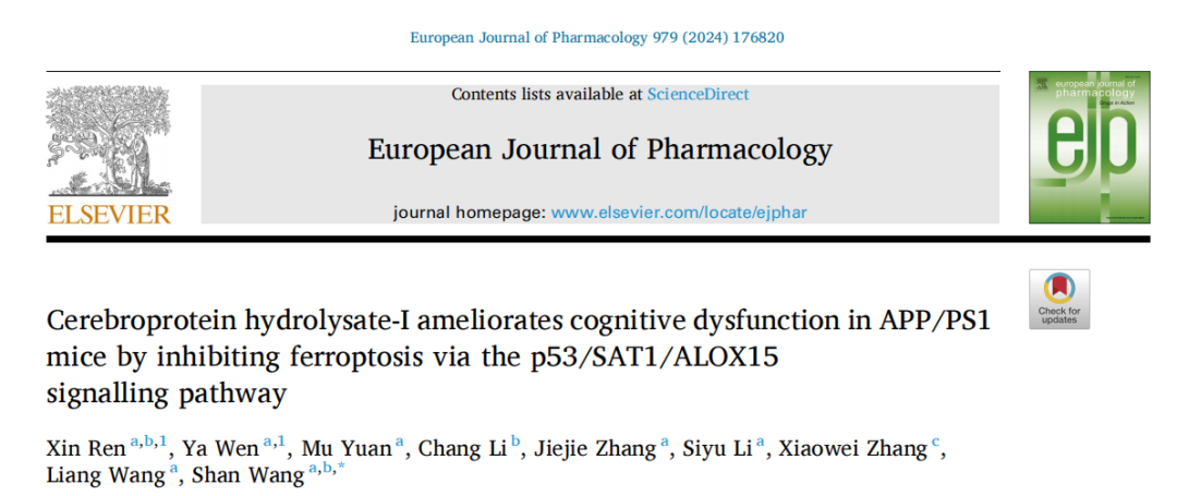 基于此,河北医科大学第二医院神经内科王珊研究团队在《European Journal of Pharmacology》杂志发表了“Cerebroprotein hydrolysate-I ameliorates cognitive dysfunction in APP/PS1 mice by inhibiting ferroptosis via the p53/SAT1/ALOX15 signalling pathway”揭示了脑蛋白水解物-I通过p53/SAT1/ALOX15信号通路抑制铁死亡改善APP/PS1小鼠的认知功能障碍。