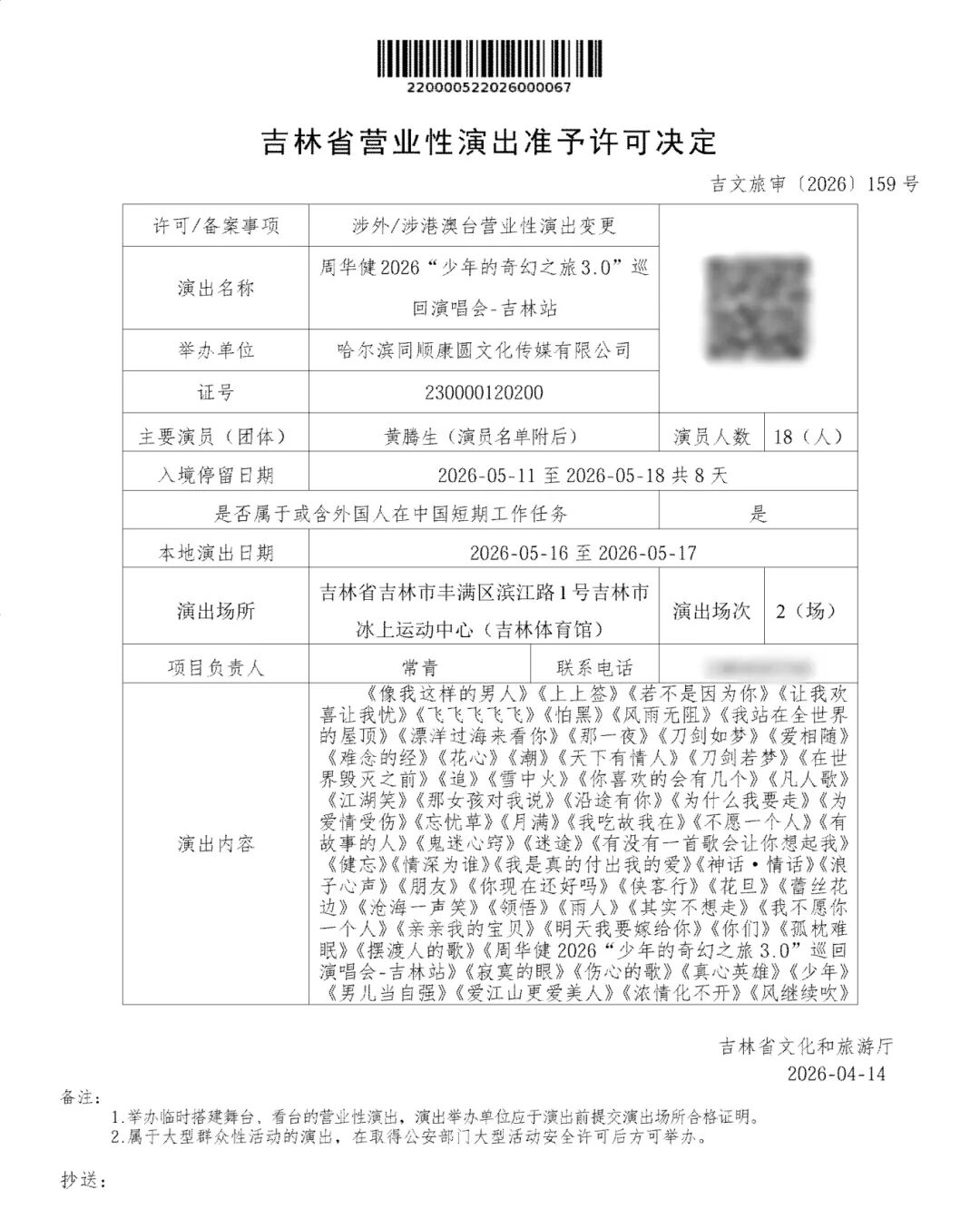 巡回演唱会-吉林站演出的许可决定