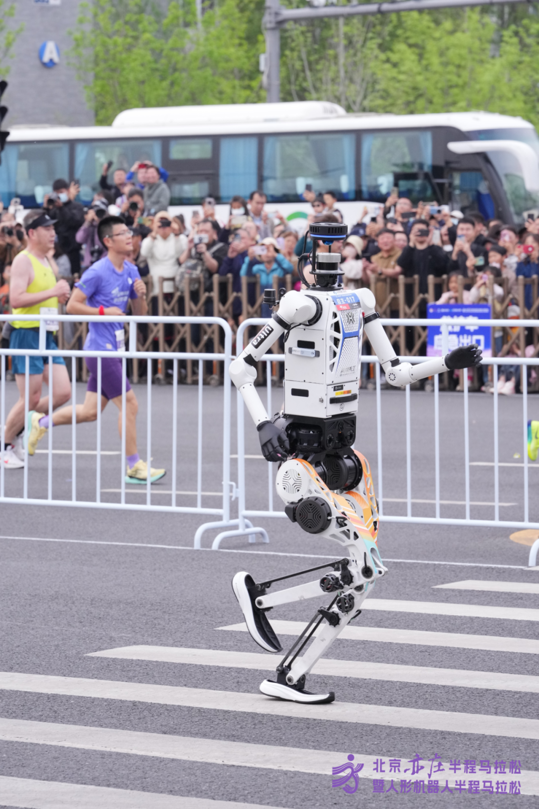 发令枪响不到一个小时,终点区便迎来首位冲线机器人跑者——荣耀“绝影赤兔队”的“闪电”。