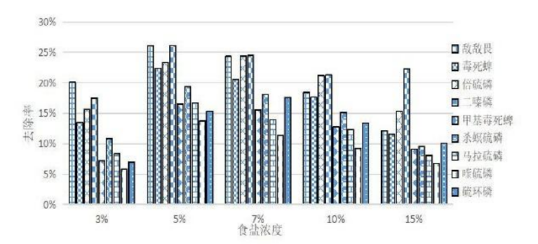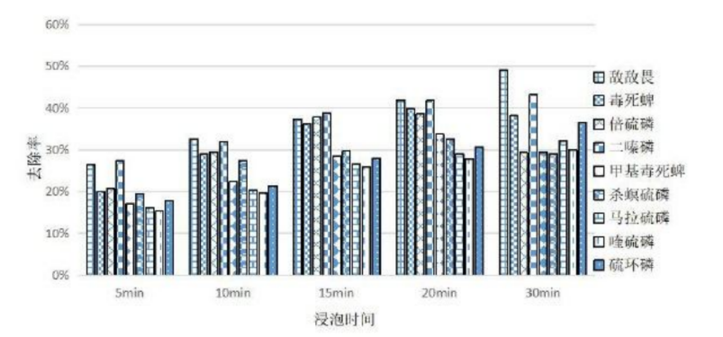 此外,国内也有不少学者研究了碳酸氢钠对农药的去除效果,比如山西省夏县综合检验检测中心的研究者找来了更多种农药,选择了9种有机磷农药。清洗方式包括用清水、食盐水(浓度包括 3%、5%、7%、10%、15%)、小苏打水(浓度也为 3%、5%、7%、10%、15%)、淘米水清洗。