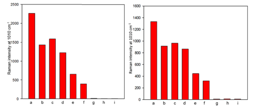 e 为在漂白剂中浸泡 8 分钟,f 为在碳酸氢钠中浸泡 8 分钟,g 为在碳酸氢钠中浸泡 12 分钟(右图为 15 分钟)的农药残留,图片来源:参考文献 3