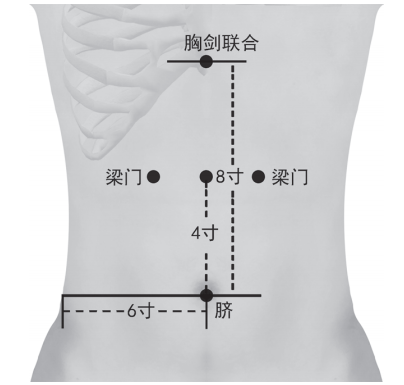 两侧肋弓往上循行的交点与肚脐连线的一半长度定为4寸,其旁开2寸即为梁门。