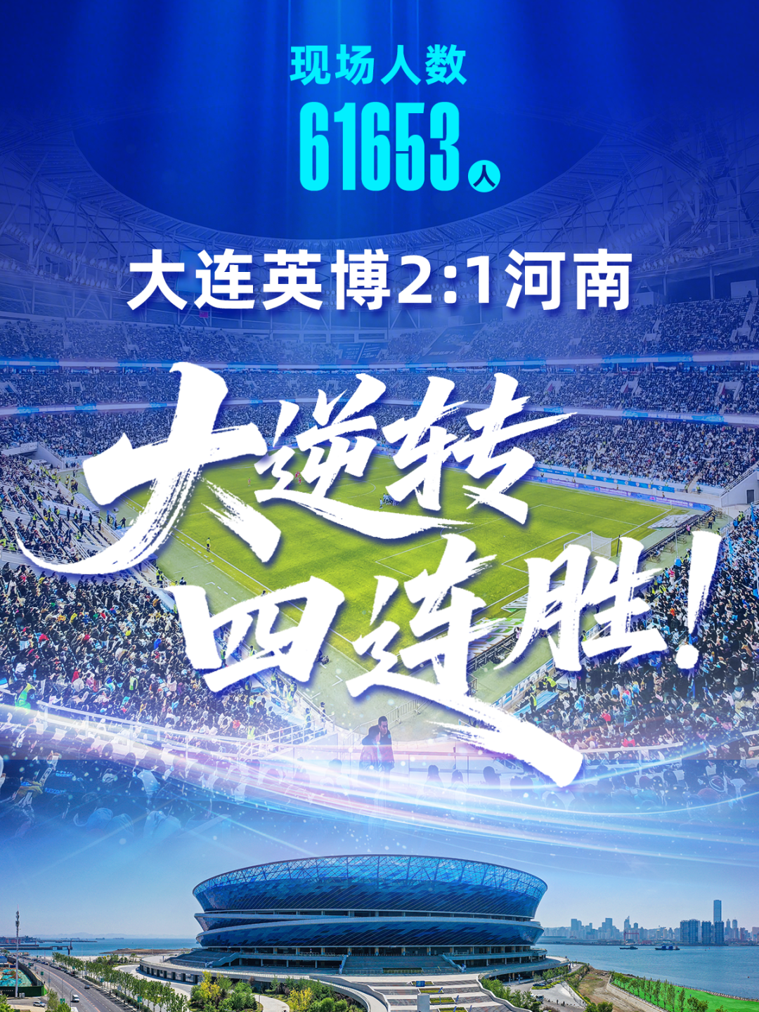 2:1!四连胜!大连英博主场61653人助威!