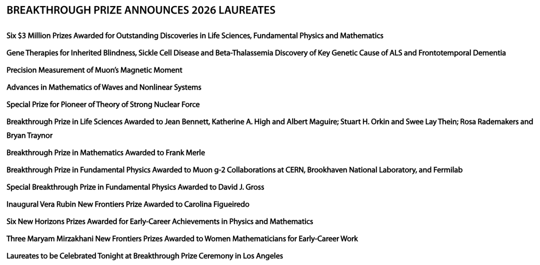 素有「数学界奥斯卡」美誉的2026年突破奖出炉了!