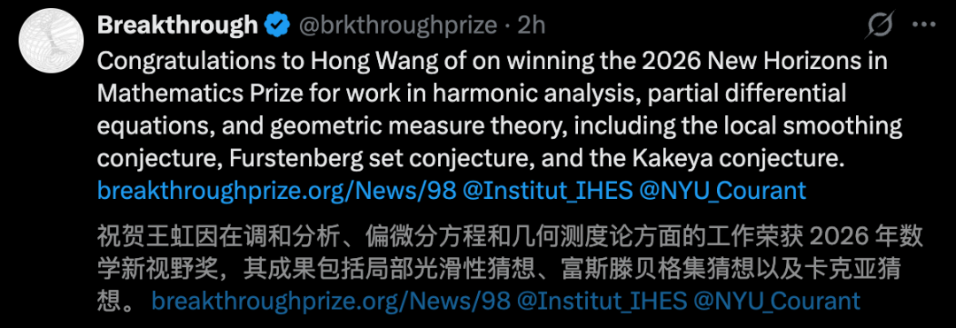 在本届名单中,数学新视野奖(New Horizons in Mathematics Prize)表现尤为亮眼。