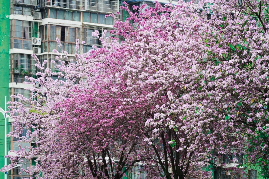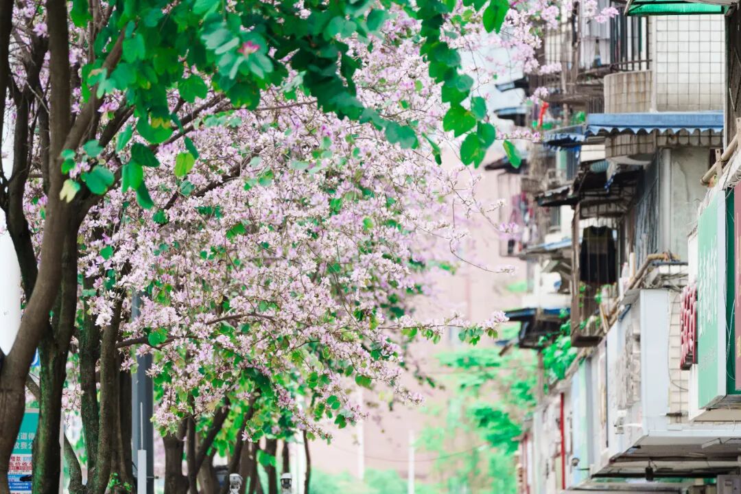 这份浪漫从来不是偶然的馈赠,而是十年光阴沉淀出的匠心。自2015年启动示范街区建设以来,这些宫粉紫荆在红光街道的细心养护下,从纤细单薄的小苗,慢慢长成了如今树冠相连、花荫蔽日的“繁花夹道”。每年春天如期而至的盛放,都是时光对这份长久耐心,给出的最好回答。