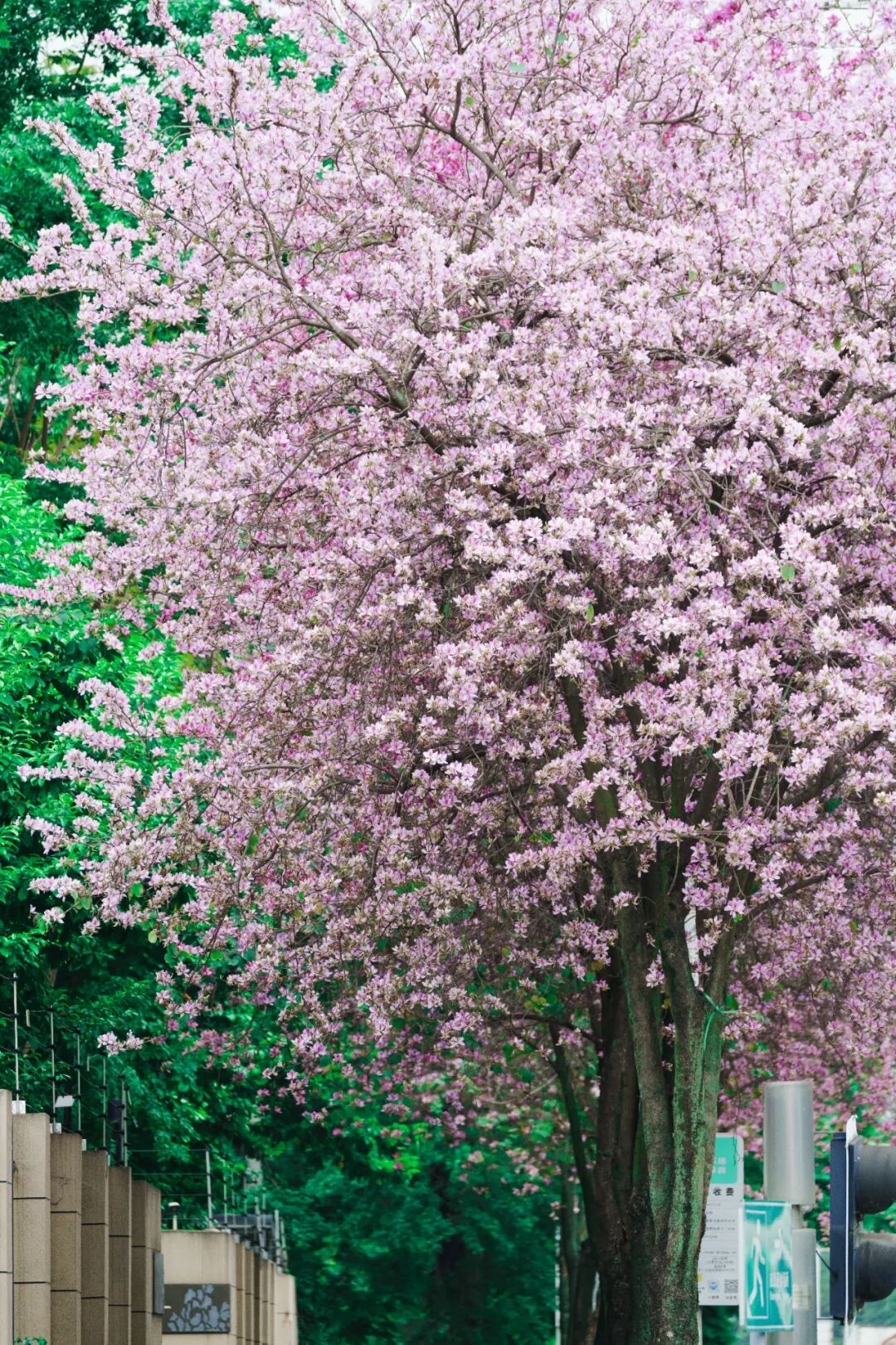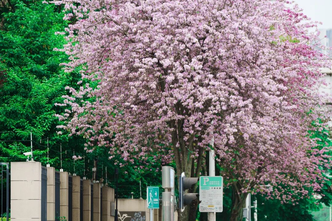 刚踏进正兴大道的瞬间,你便会懂什么叫“乱花渐欲迷人眼”——数百米的道路两侧,百余株宫粉紫荆正赴一场声势浩大的春日邀约。粉白相间的花朵挨挨挤挤爬满枝头,像两条蓬松柔软的粉色丝带,沿着道路向着远方绵延开来,连漏下来的阳光,都被筛成了温柔缱绻的粉金色。