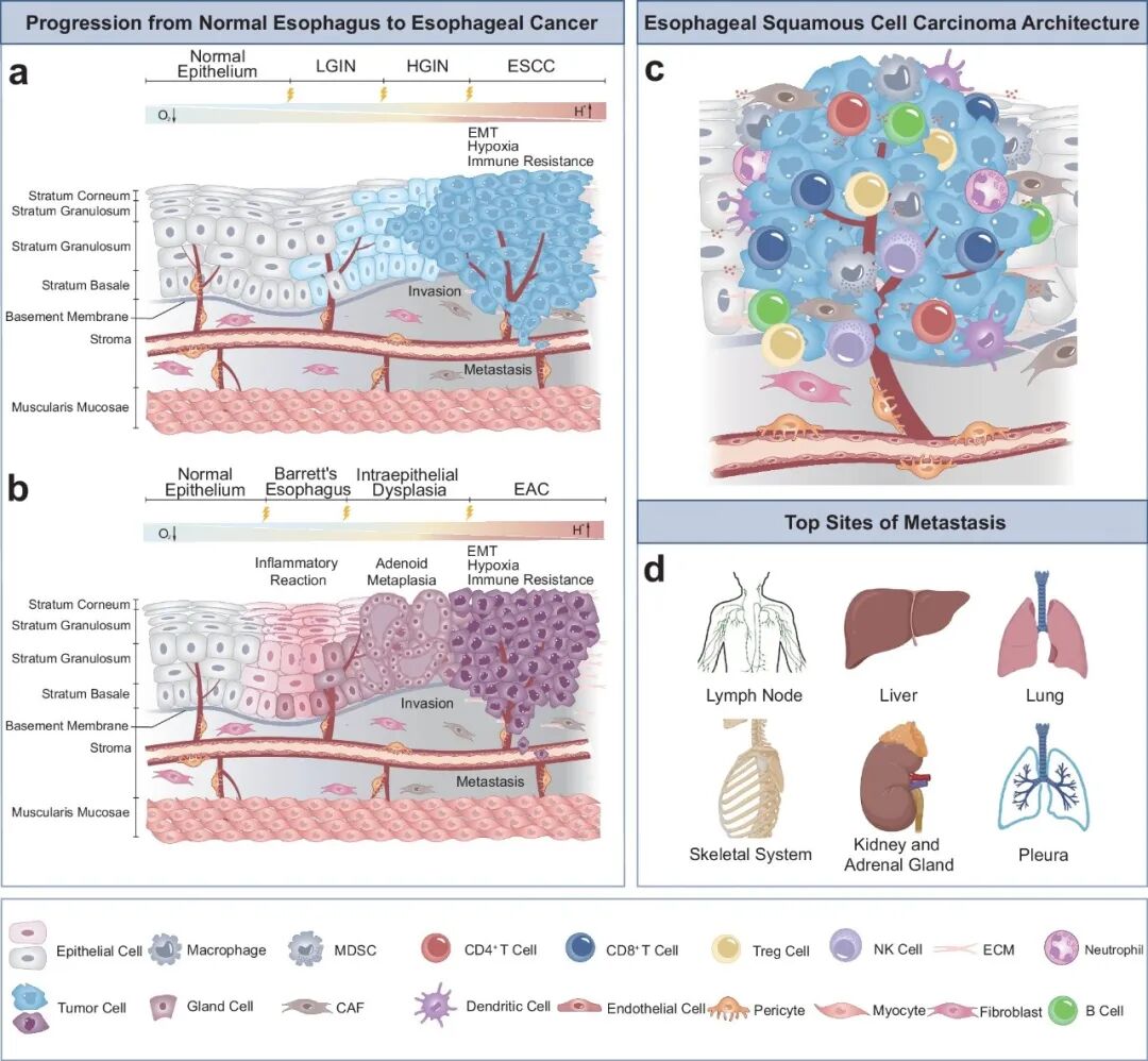 食管鳞状细胞癌与腺癌的癌变过程、局部微环境的细胞组成及常见转移途径
