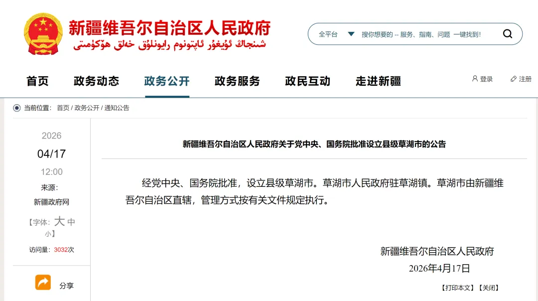 新疆维吾尔自治区人民政府关于党中央、国务院批准设立县级草湖市的公告