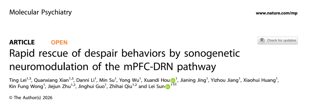 2026年4月17日,来自香港理工大学孙雷教授团队做了一项专门研究,标题为《 Rapid rescue of despair behaviors by sonogenetic neuromodulation of the mPFC-DRN pathway 》,相关成果发表在《Molecular Psychiatry》期刊上。