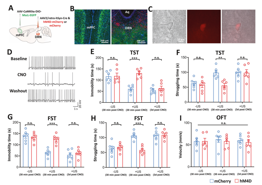 为了证实抗抑郁效果确实是通过激活mPFC-DRN通路实现的,研究者用化学遗传学(hM4D)抑制了DRN神经元的活性。
