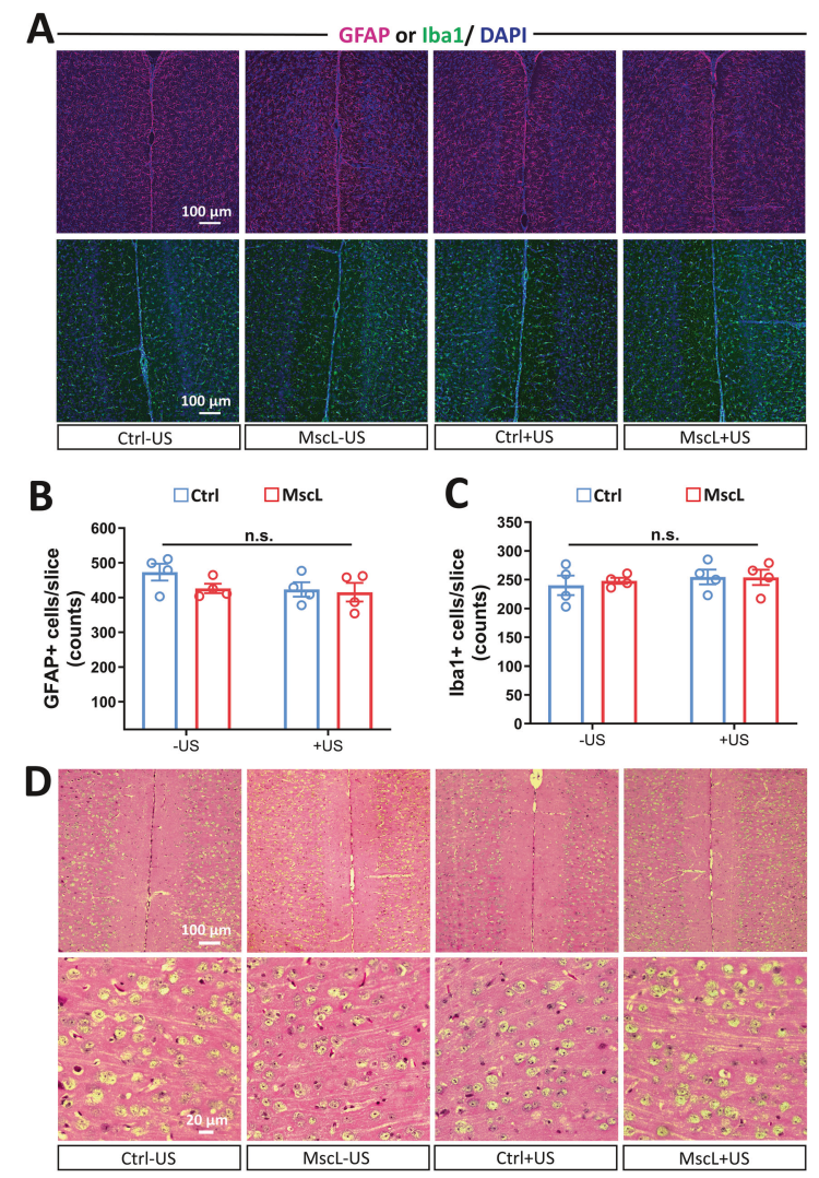 结果显示,0.3 MPa超声刺激20分钟后,小胶质细胞和星形胶质细胞无异常激活,无明显神经炎症。神经元形态完整,无坏死、水肿或组织损伤。即使将超声强度提升至0.5 MPa(远高于有效参数),仍未出现病理改变。