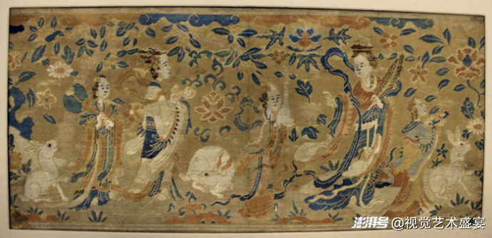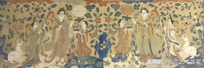 无独有偶,在馆藏作品中,美国大都会艺术博物馆藏有一件“月宫仙女与玉兔”(Panel with the Moon Goddess and Attendants)的宋锦作品(见下图),与本幅所用的纹样图案、工艺手法几乎一致,还有造型特征、色彩、质地乃至边缘纹样装饰等等都极为接近,显然是同一时期,乃至同一地域所产。大都会博物馆将此宋锦定为12世纪至13世纪,即宋朝(960-1279)至元朝(1271-1368)所制,同样也有金线装饰,纹样内容为:四位身着华丽服饰的仕女,暗示她们的身份是神仙,遍地密花的布局,右图中人物所持桂花叶似为嫦娥,她和一只准备长生不老药的兔子一起住在了她的天宫之中。可见二者同为宋元时期官造宋锦。