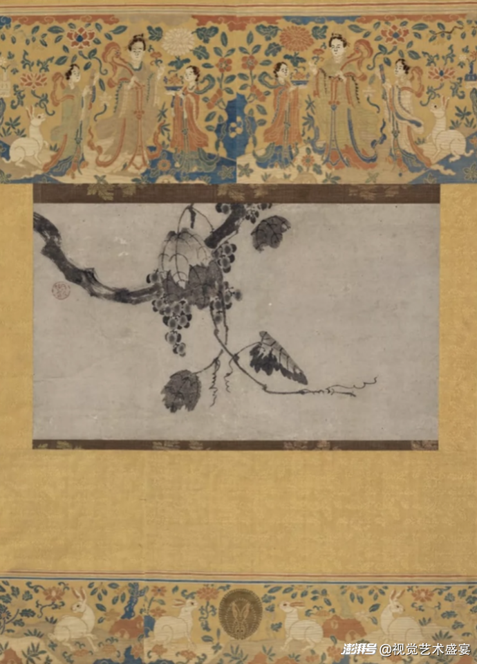 用华美的中国宋元时期的宋锦来装裱纯水墨简笔禅宗墨葡萄,形成了一个强烈艺术审美对比。