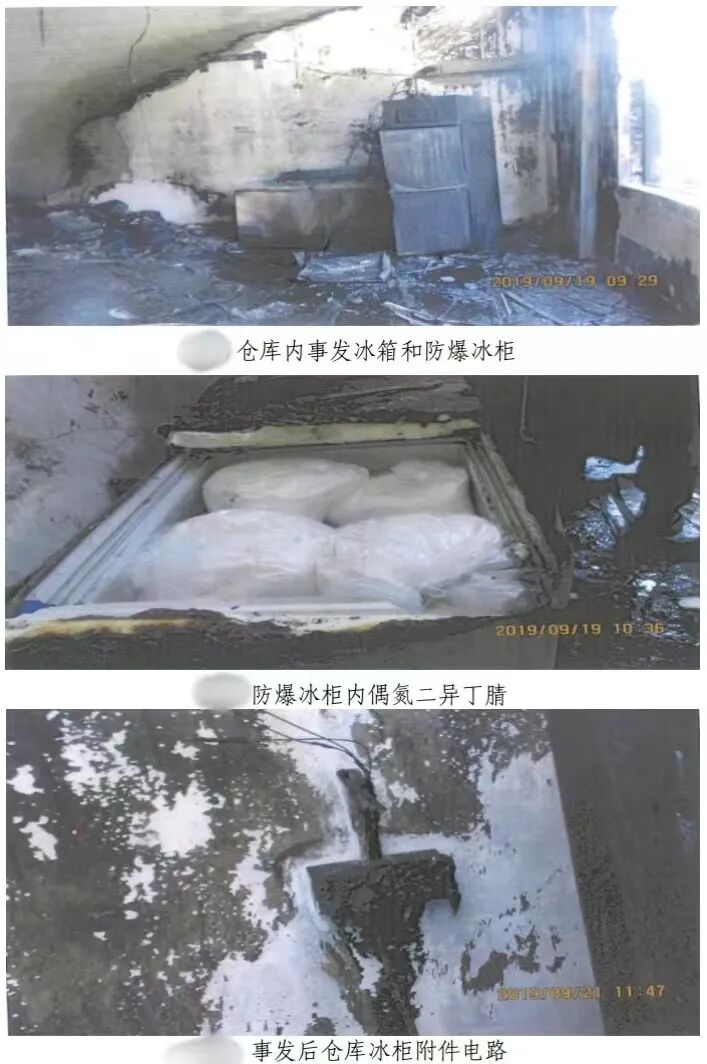 20时20分,公司采购物流部仓库管理班班长燕某忠接到向某斌报告称,C1幢首层小仓库立式防爆冰箱不制冷,存放在里面的物料桶(企业自编号HA336)胀裂。燕某忠当即致电公司机电部安排值班电工刘某前来处理并前往现场,燕某忠抵达现场后,看到冰箱门呈半开状态,冰箱上下两层储存格各放置有两桶物料,下层储存格靠前的一桶倒在地上、桶表面发热并且产生鼓胀,靠里的一桶物料爆开了一个裂口,里面剩余约3/5桶的物料,同时,发现有液体状物料溅射到地面及对面的墙上,并散发强烈的刺激性气味。见此情况,燕某忠打电话通知仓管员兼物料员黄某华前来处理,且由于发现冰箱温度显示31℃-32℃、冰箱不制冷,他随即把电源插头拔掉。