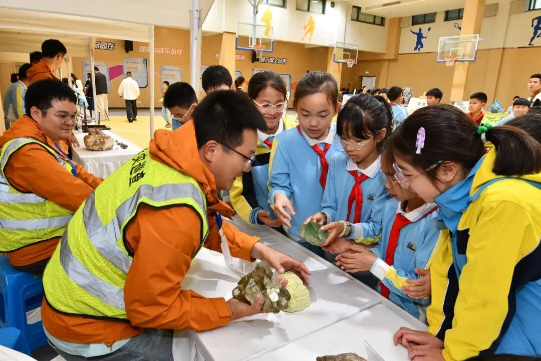 校园里,自然资源保护市集热闹非凡。“我身上的铠甲是用家里积攒的快递纸箱做的!”“这件裙子是用废弃塑料袋做的!”小小讲解员自豪展示创意作品,资源样本展示区前围满好奇的身影。“岩石为什么会有花纹?”“矿石的颜色为何不同?”孩子们的问题不断,志愿者们耐心解答,讲述着岩石背后有趣的科学知识、标本背后不为人知的地球故事。