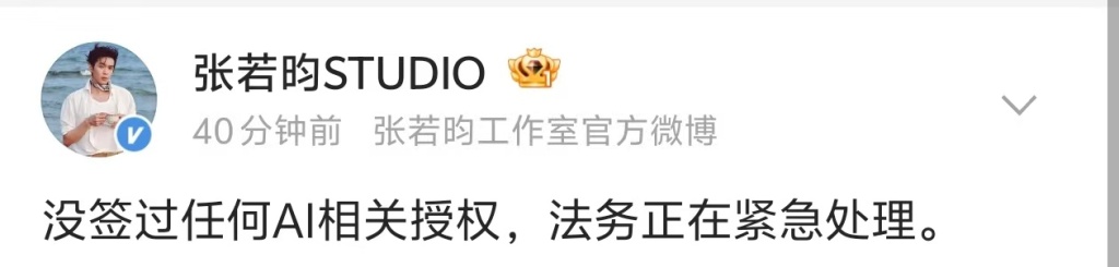 随后,包括张若昀、李一桐、于和伟等多位艺人也通过工作室微博与粉丝对接账号发声,称未签署过任何AI授权。此前,张若昀在接受采访时就曾表示过:“AI永远取代不了完全的表演,想跟观众交流的机会是取代不了的。”