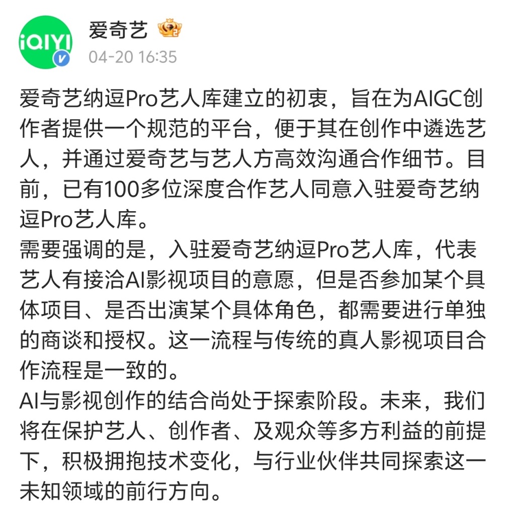 引发轩然大波后,爱奇艺发文回应称“建立纳逗Pro艺人库的初衷,旨在为AIGC创作者提供一个规范的平台,便于其在创作中遴选艺人,并通过爱奇艺与艺人方高效沟通合作细节”。同时强调,“入驻爱奇艺纳逗Pro艺人库,代表艺人有接洽AI影视项目的意愿,但是否参加某个具体项目、是否出演某个具体角色,都需要进行单独地商谈和授权。这一流程与传统的真人影视项目合作流程是一致的。”
