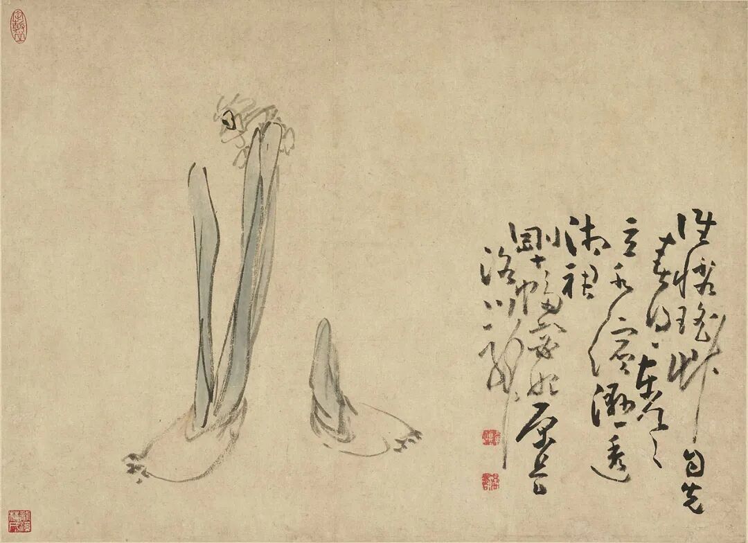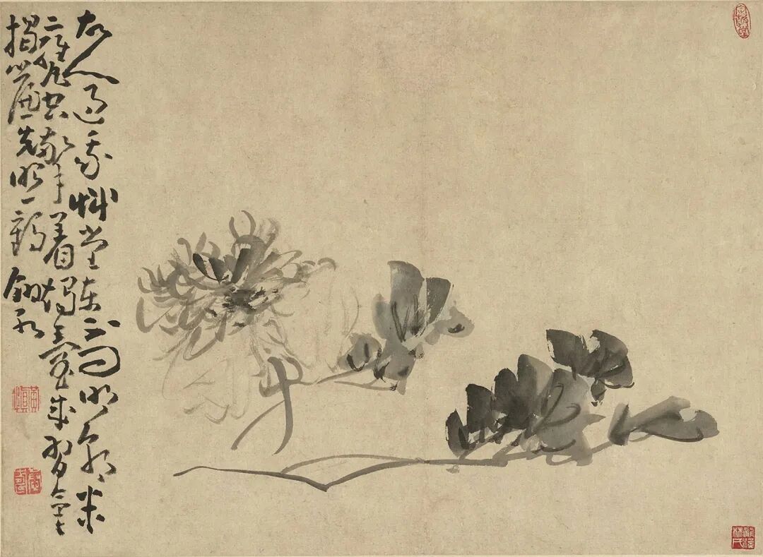 黄慎(一六八七-一七六八),福建宁化人。字恭懋,号瘿瓢。家贫无以为继,遂学画,康熙五十八(一七一九)年鬻画于扬州,开创笔墨新趣,为扬州画派重要画家。本册共计六幅,分别描绘碧桃、牡丹、芍药、玉簪、水仙及梅花。用狂草笔法状写各种花卉,笔姿放纵,得荒率之趣而不失灵秀之气。以草书所题之款识与画互为映发,并臻佳妙。