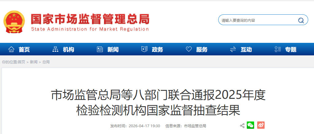 近日,市场监管总局联合公安部、国家药监局等八部门通报2025年度检验检测机构国家监督抽查结果,位于陕西的农业农村部食品质量检验测试中心(杨凌)因涉嫌违法违规被点名。